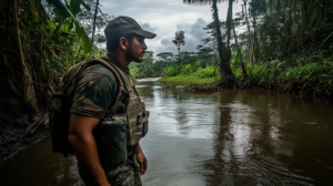 El trabajo de un defensor del medio ambiente en Colombia está marcado por la valentía y, muchas veces, la desesperación. Estas personas no solo luchan contra la explotación de los recursos naturales, sino también contra la impunidad y la indiferencia de un Estado. Ilustración MidJourney.